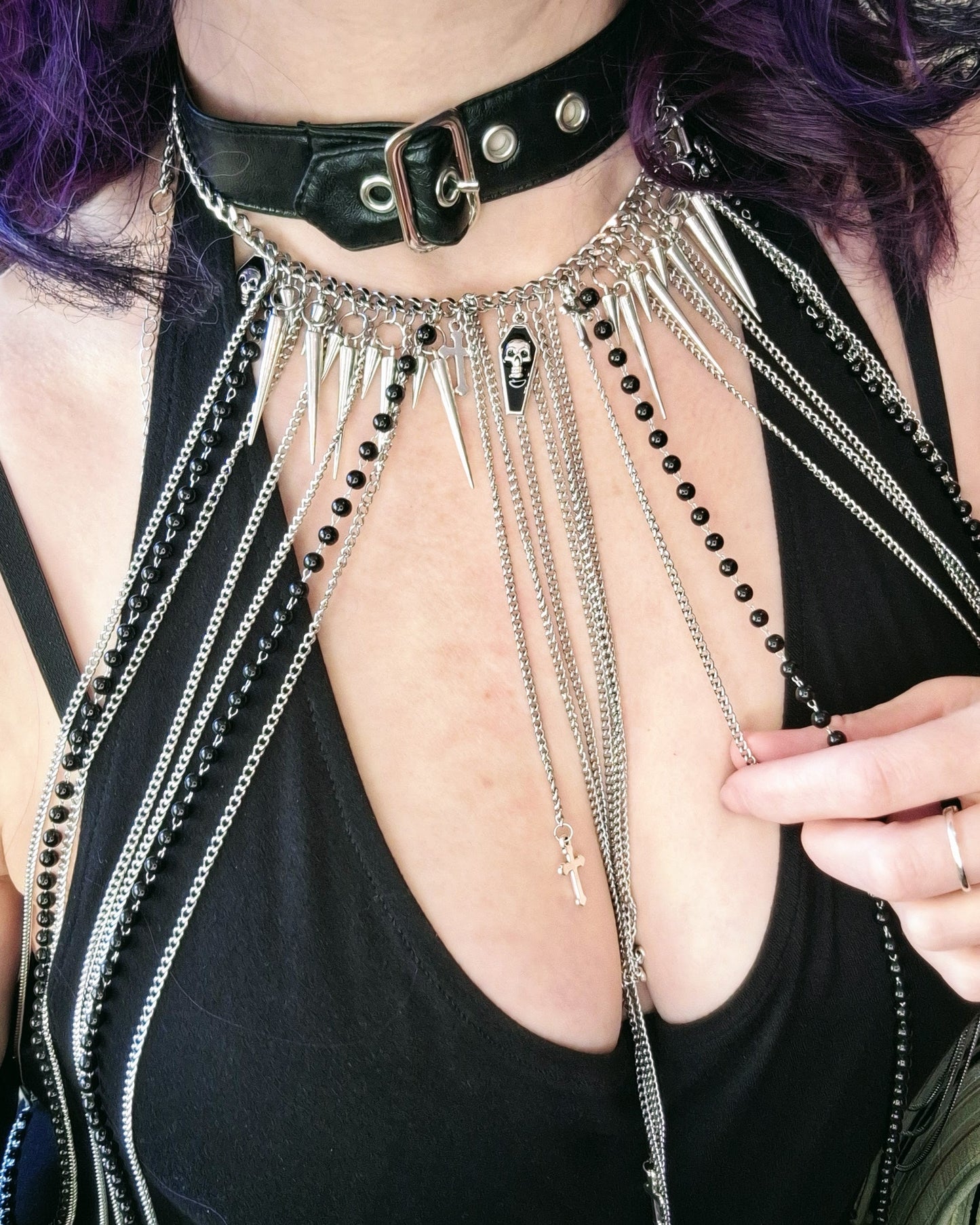 Add some serious drama to your outfit with the Punk Rave Vicenta Chest Chains Necklace. This unique and stunning piece features spikes, beads, and chains, as well as coffin shapes and crosses. Perfect for dialling your outfit up to 11!